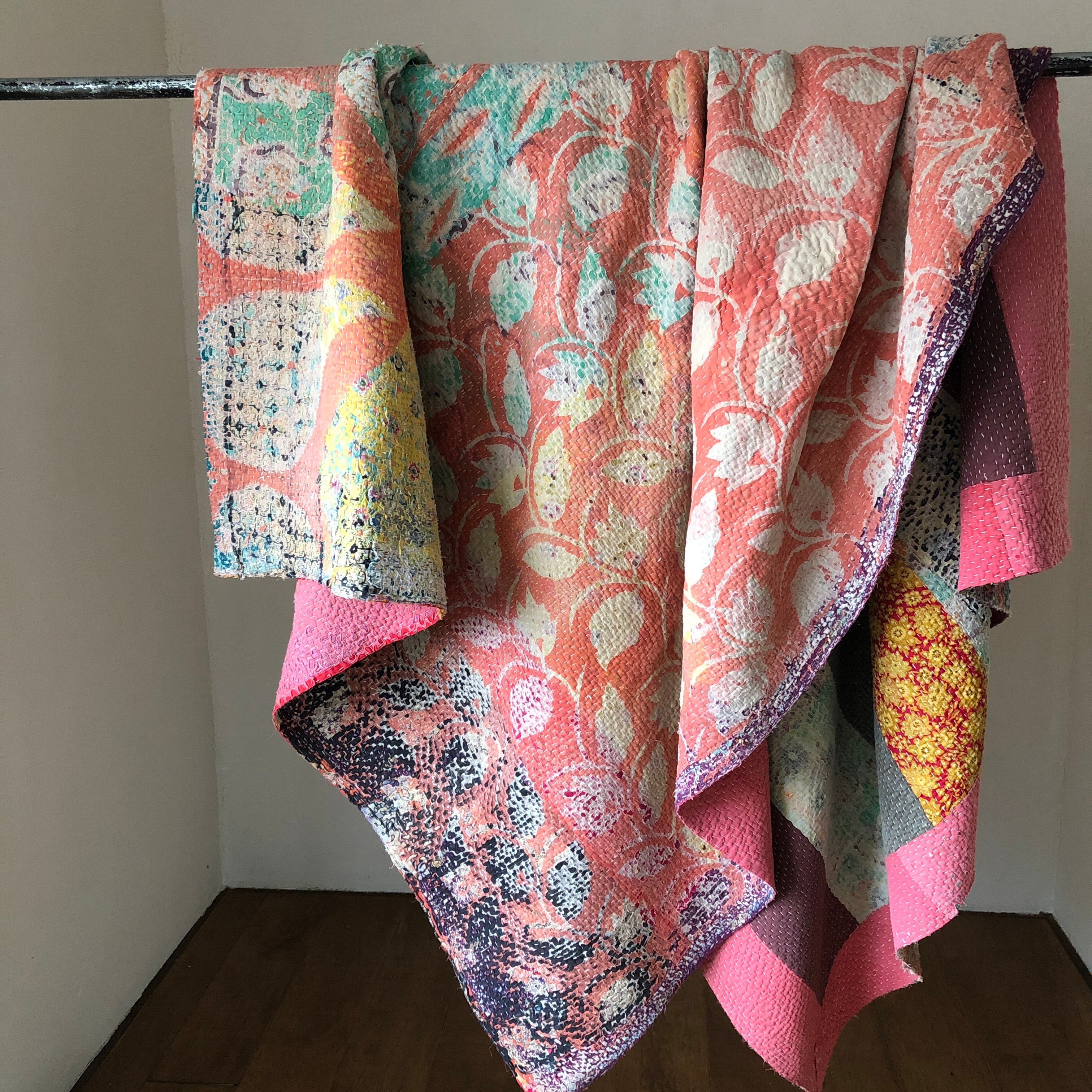 Vintage pink patchwork kantha quilt カンタキルト ラリーキルト