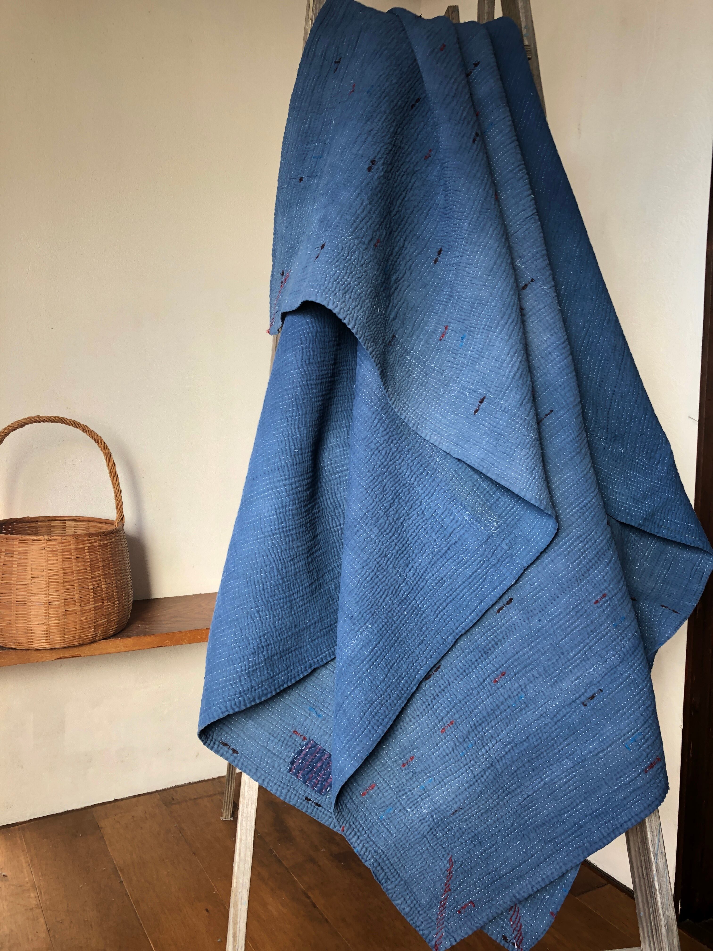 ビンテージカンタキルトにインディゴでオーバーダイを施しています。