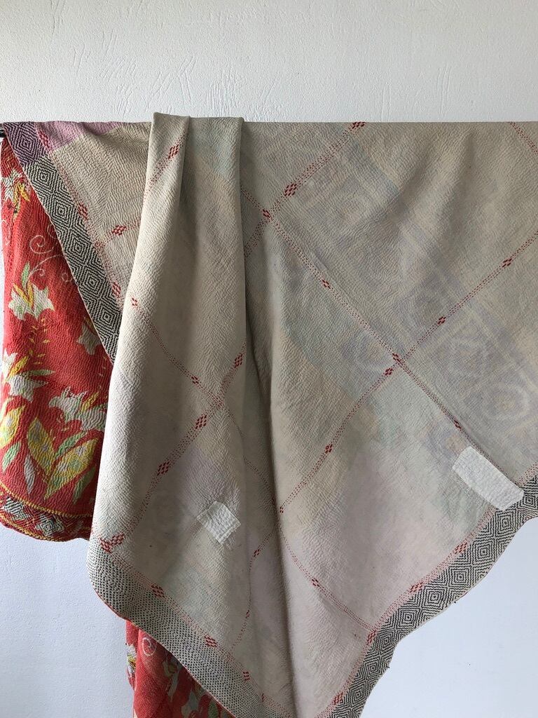 片側にはオレンジの華やかな柄、もう片側はシックなオフホワイトに縁の刺繍が印象的なカンタキルト。対照的な裏表が楽しめます。