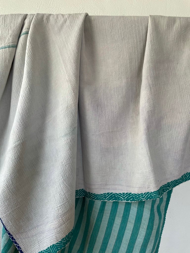 Vintage kantha quilt blue & green trim ヴィンテージ ホワイト カンタキルト